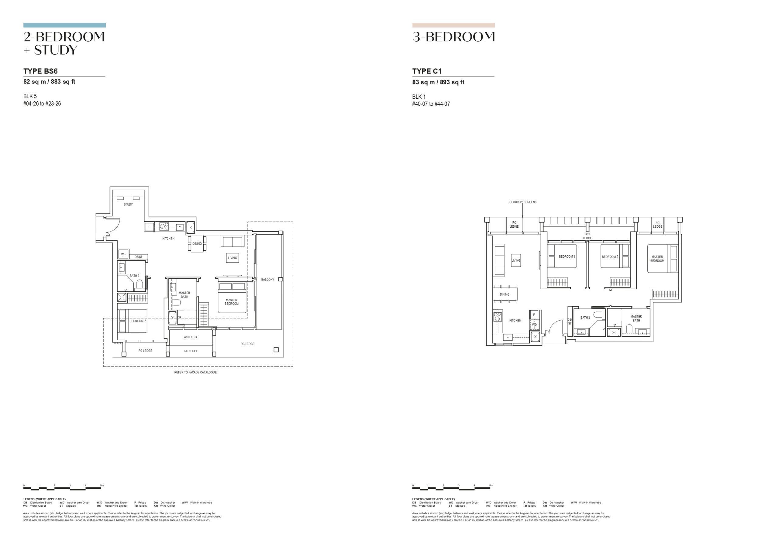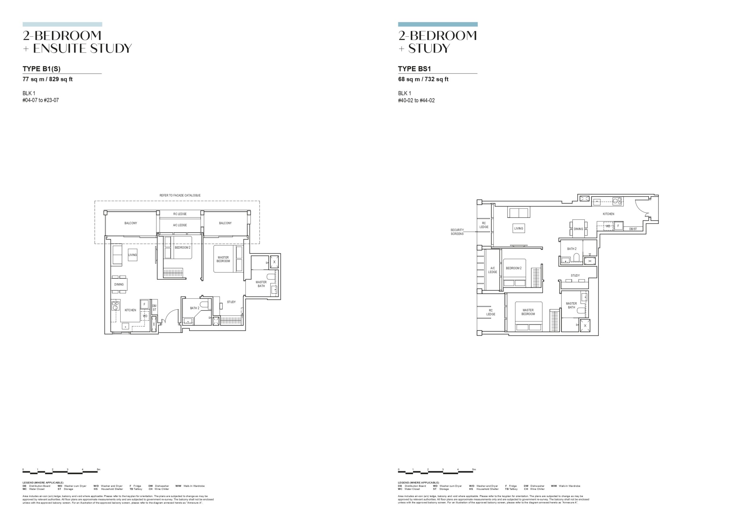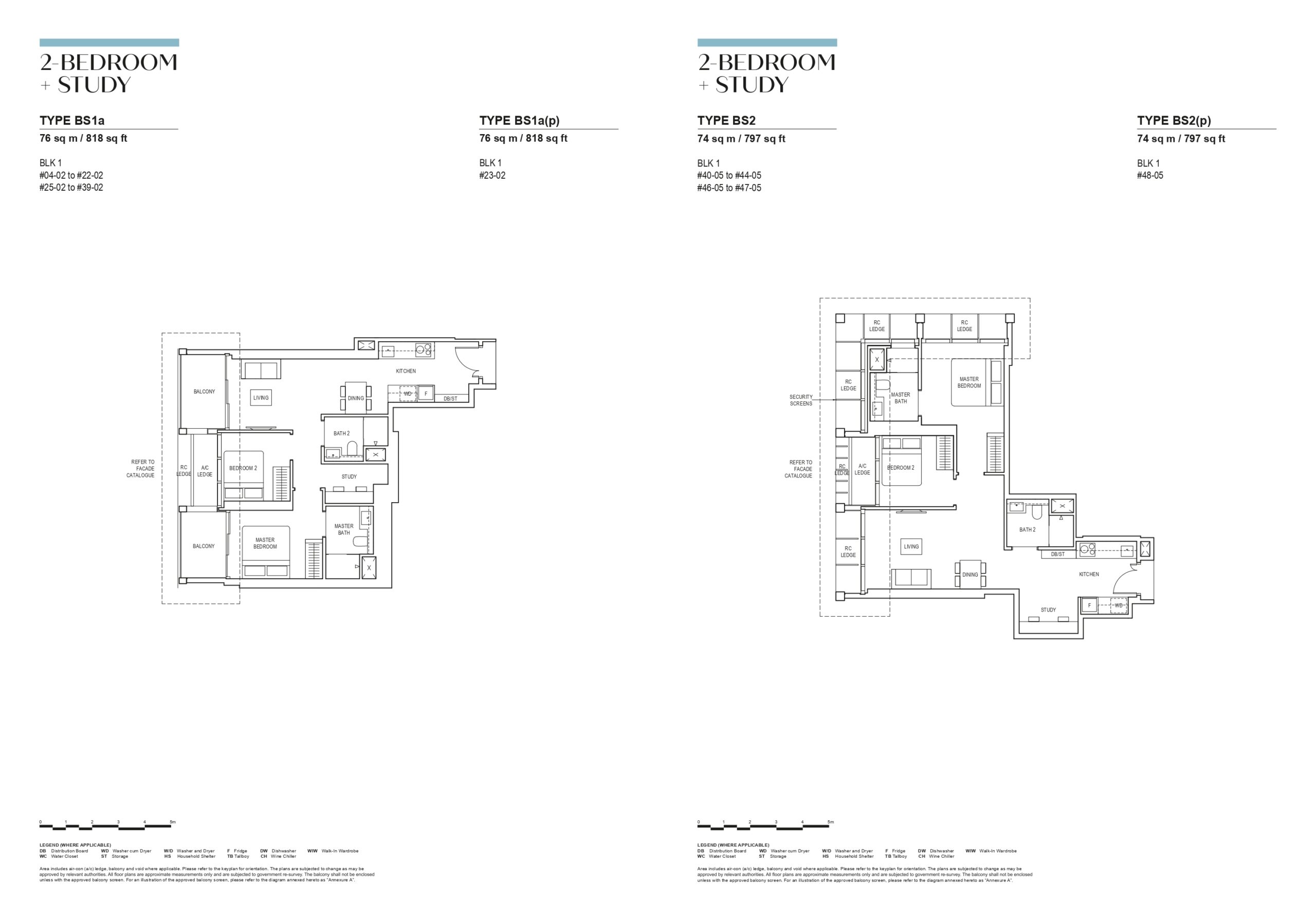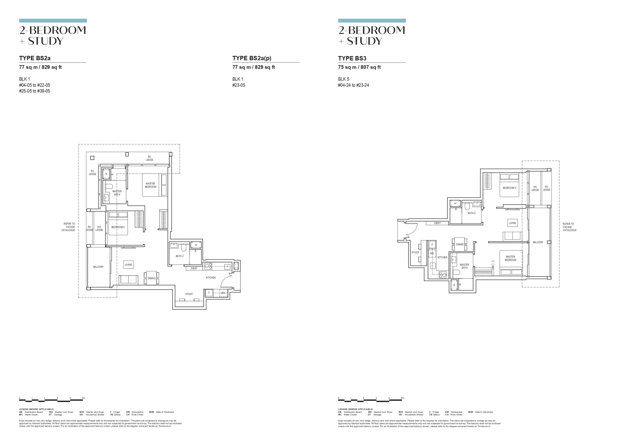 | 2 Bedroom + Study | BS | 163 | 68 – 82 | 732 – 883 |