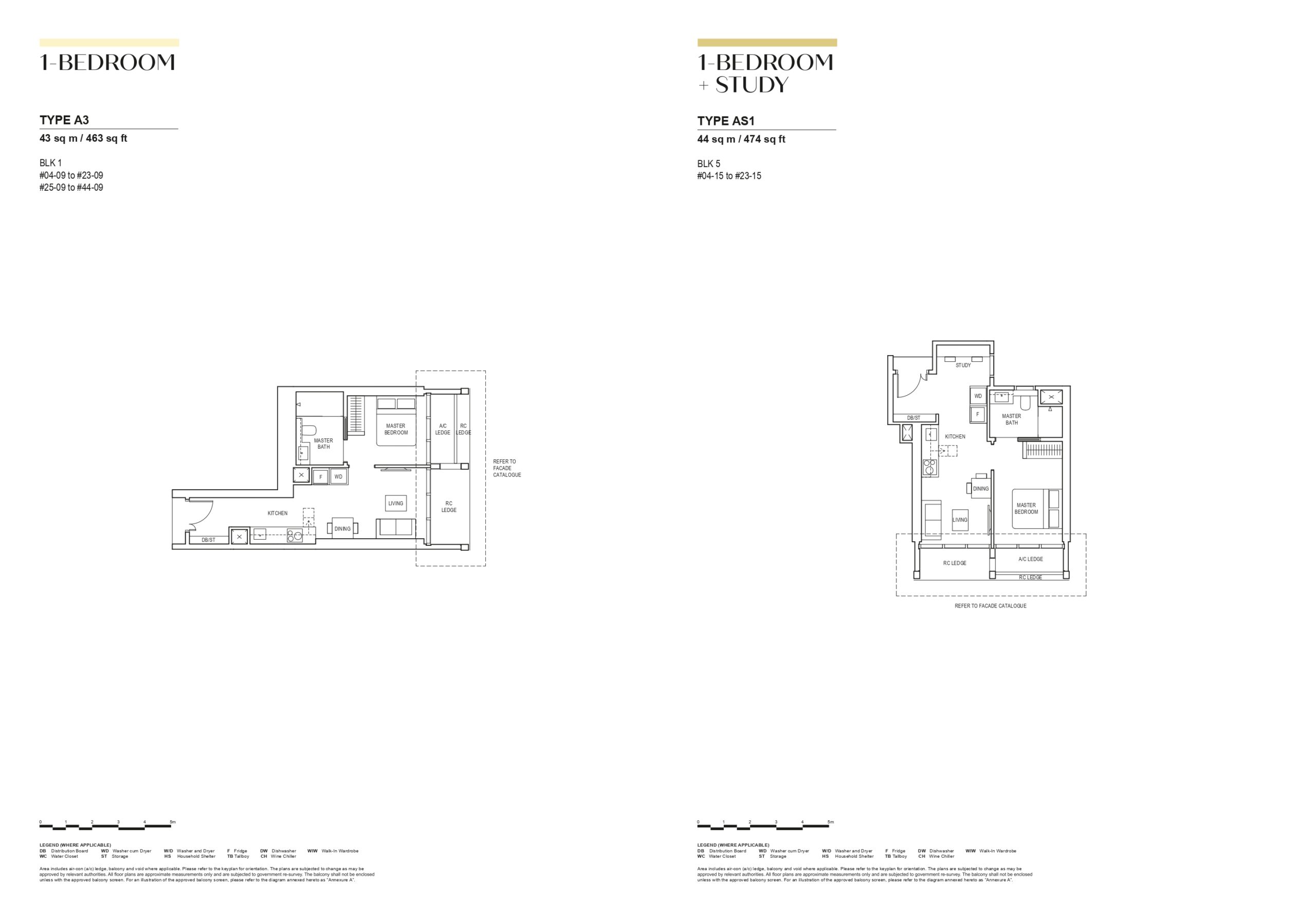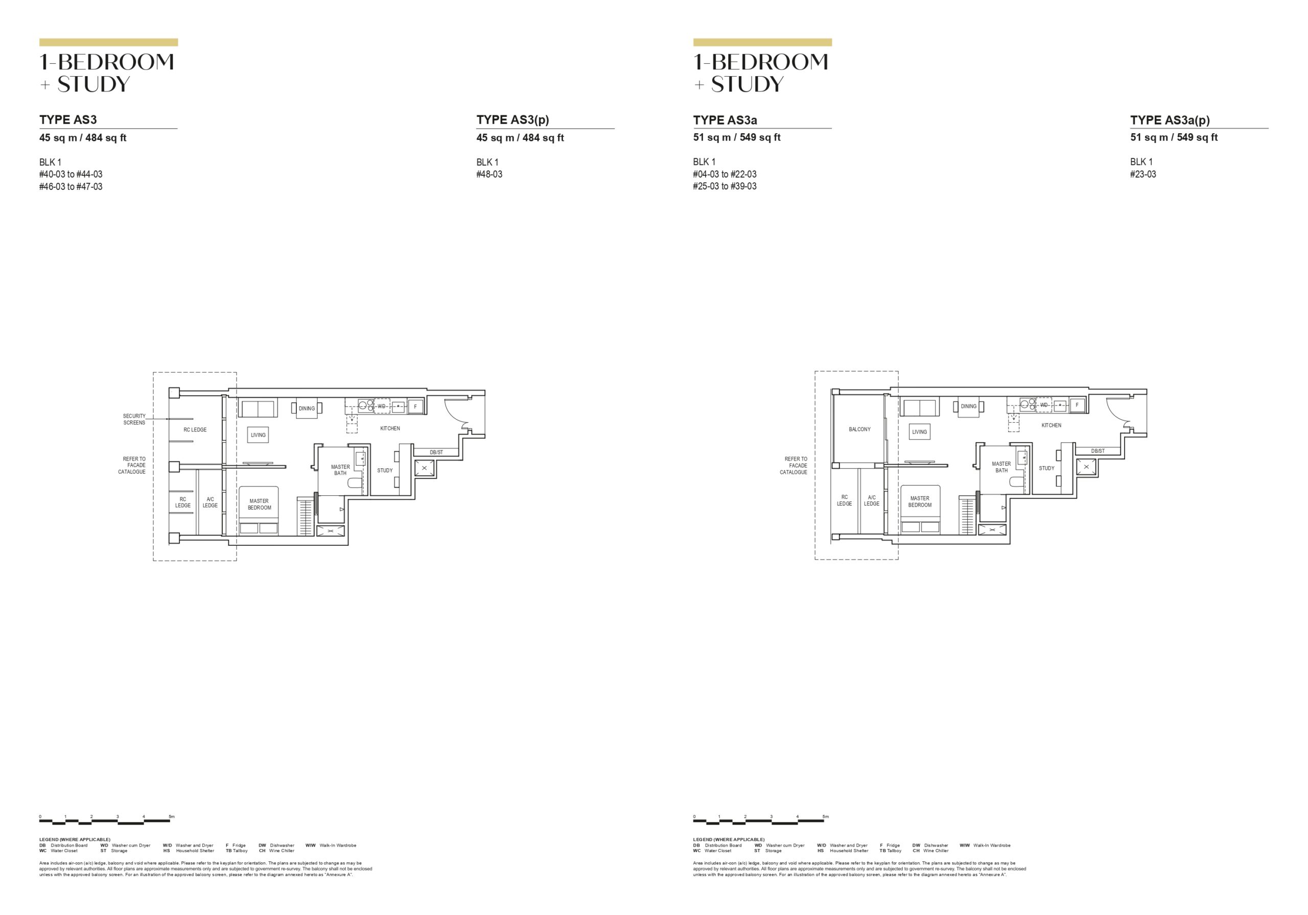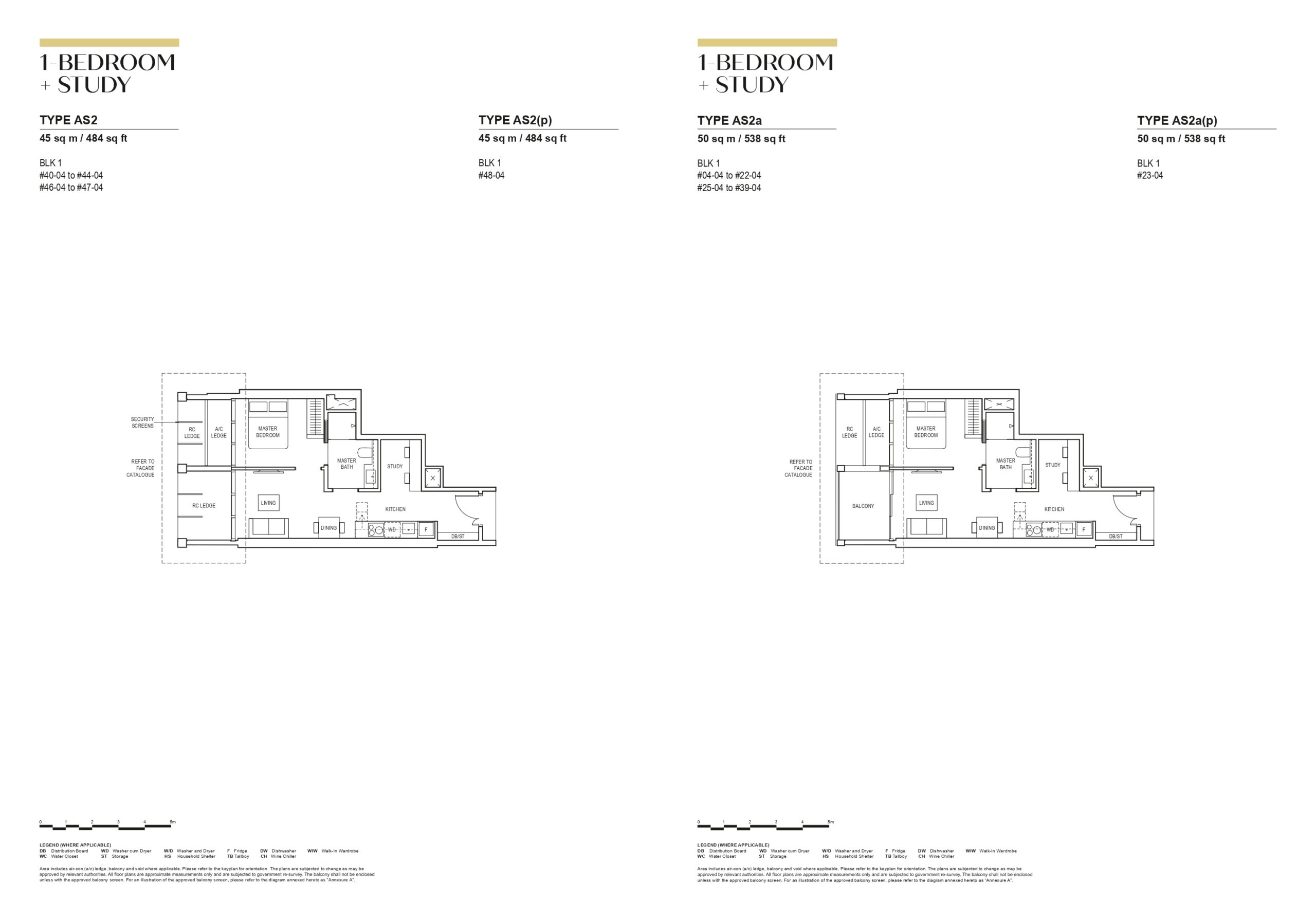 | 1 Bedroom + Study | AS | 229 | 44 – 52 | 474 – 560 |