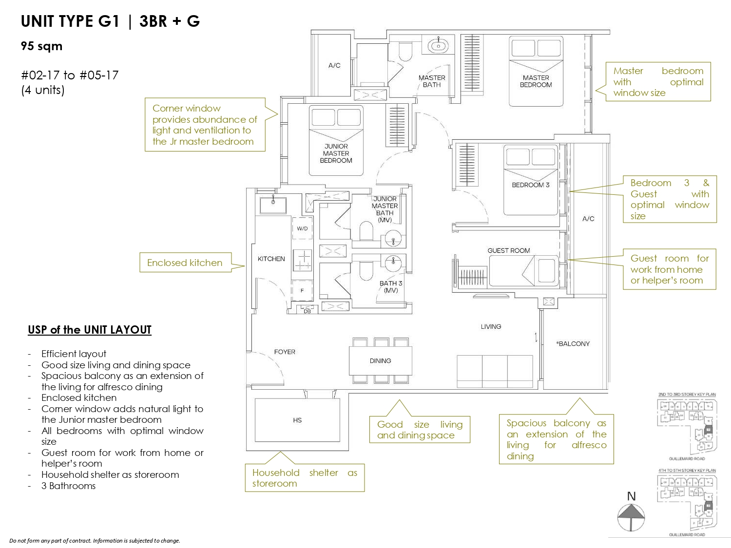 | 3 Bedroom + Guest | CG | 17 | 95 – 110 | 1,022 – 1,184 |