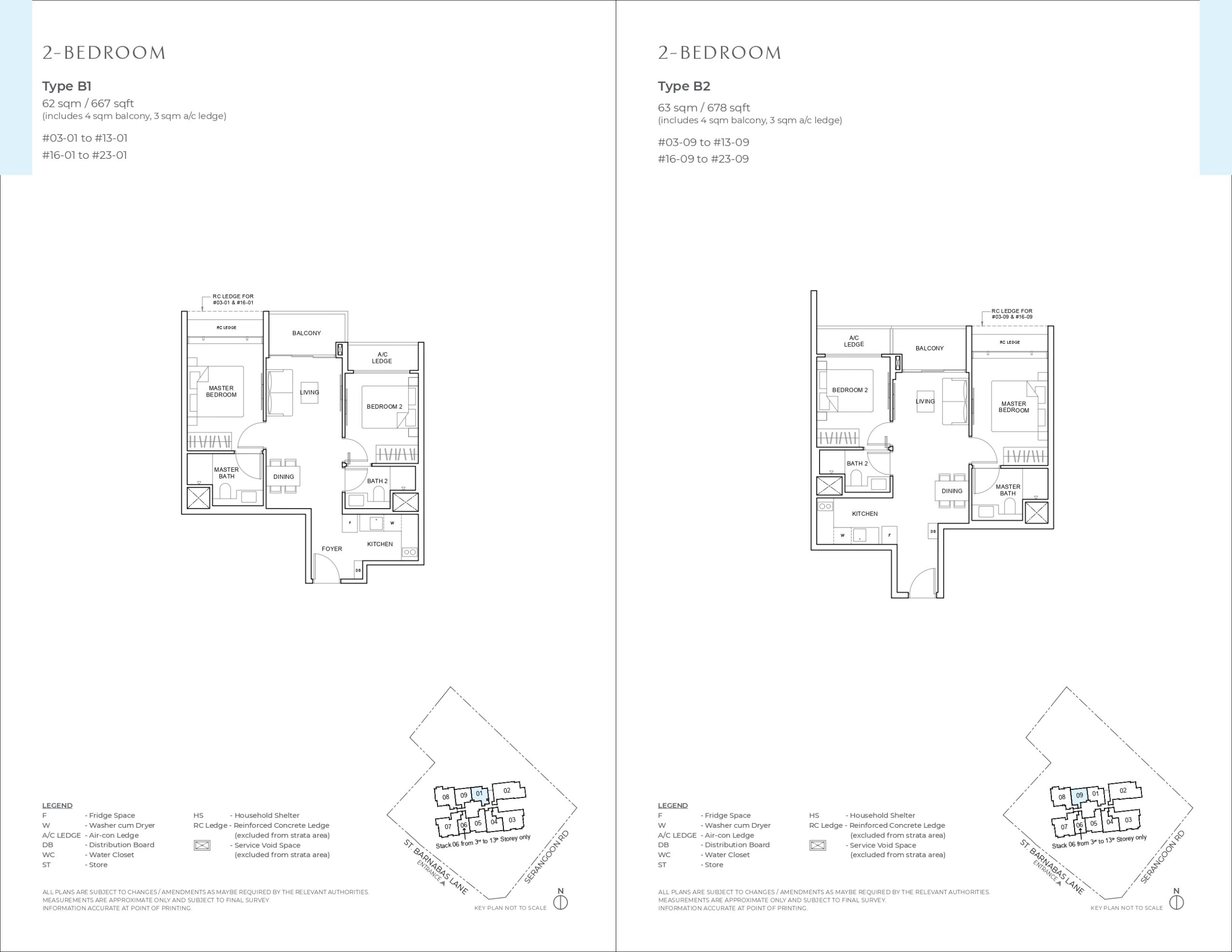 | 2 Bedroom | B1/B2 | 38 | 61/62 | 657/667 |