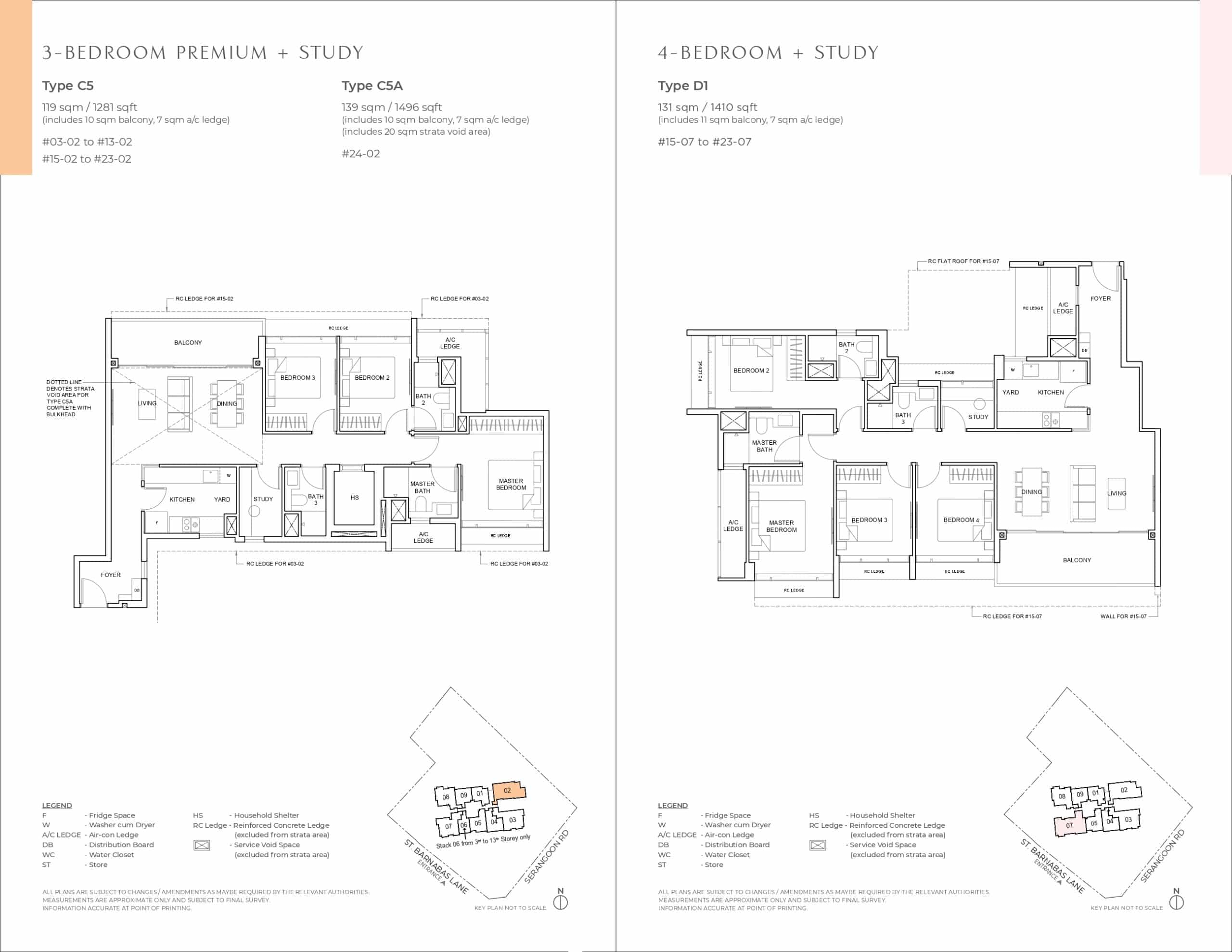 | 3 Bedroom + Study | C5/C5P | 21 | 119/138 | 1,281/1,485 |