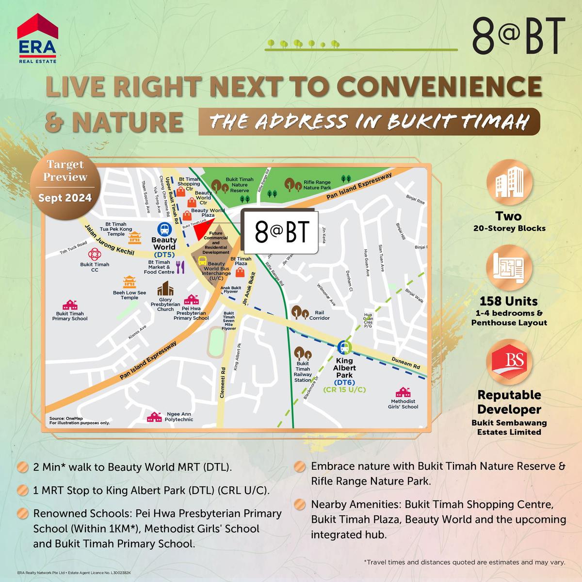 Nestled in the prestigious Bukit Timah enclave, 8@BT is an exclusive freehold condominium developed by the industry leading Bukit Sembawang Estates Pte Ltd. A stone’s throw from Beauty World MRT station, this development enjoys excellent connectivity in one of Singapore’s most prestigious addresses. Comprising an estimated 158 units ranging from studios to 4-bedroom penthouses, this rare, exclusive development embodies refined elegance and is an excellent investment in one of Singapore’s most coveted residential neighbourhoods.