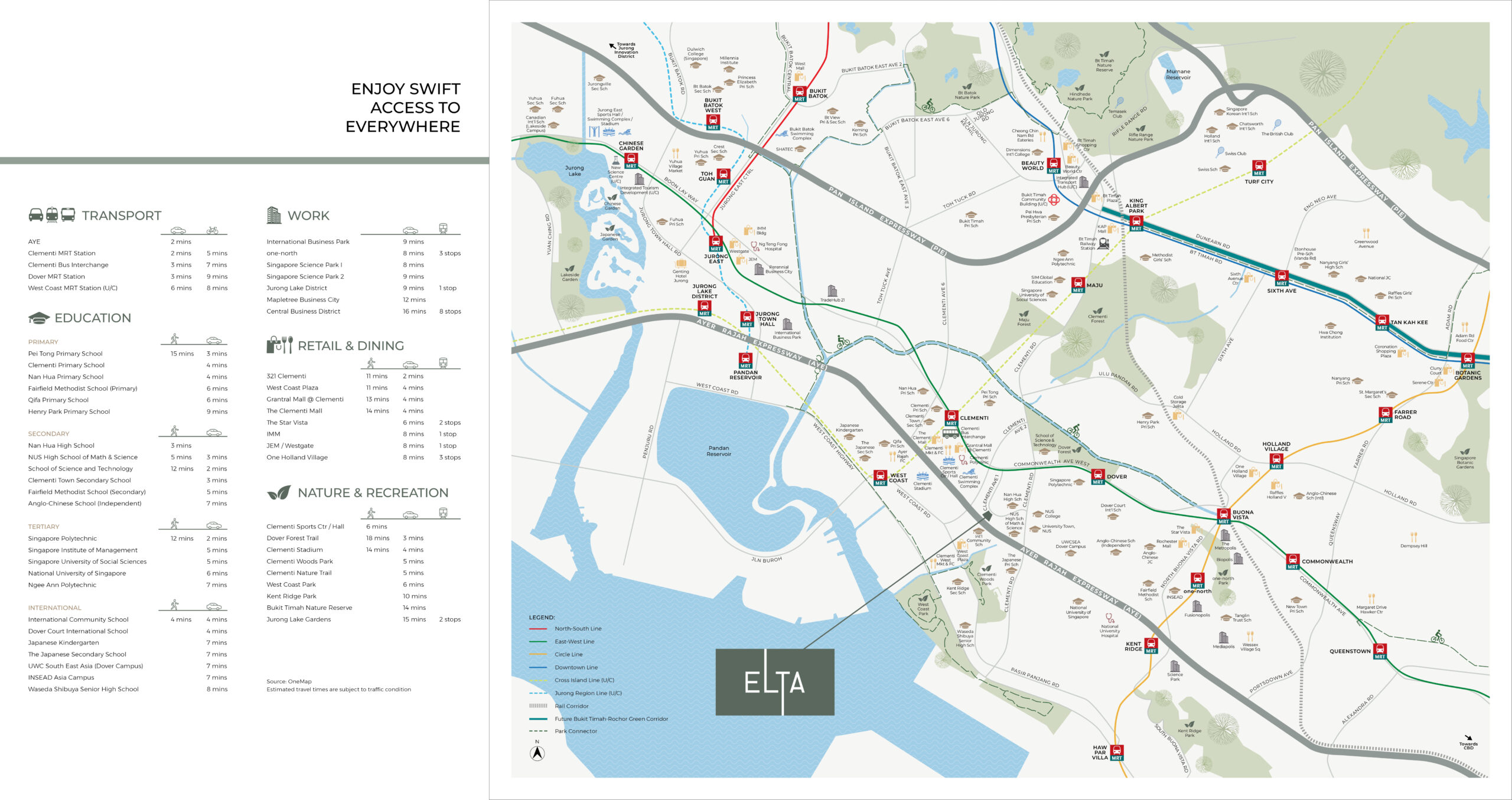 ELTA is located in District 5, enjoying a prime position in Clementi, the western part of Singapore, and an established, well-planned, mature estate. Clementi MRT along the East-West Line is a 15-minute walk away, offering residents quick access to the Central Business District, Orchard Road, Marina Bay, and Jurong East district, as well as key interchanges like Dhoby Ghaut and City Hall.
