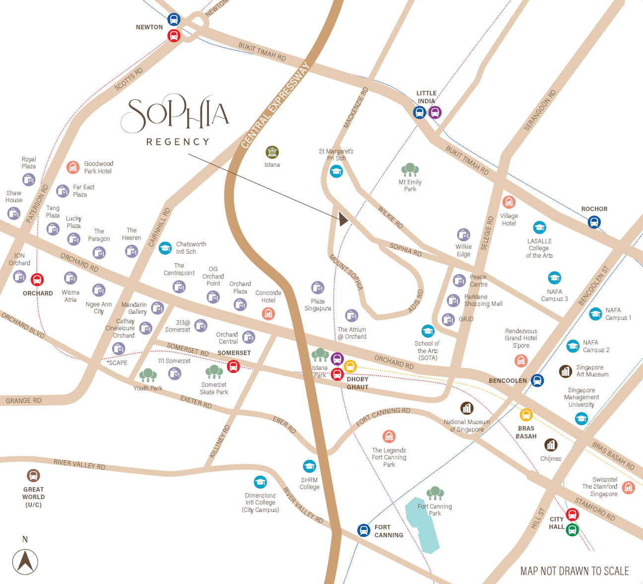 Sophia Regency is located along Sophia Road in the heart of District 9, one of Singapore’s most prestigious addresses. Exceptionally well-connected, the development is walking distance from three MRT stations: Dhoby Ghaut, Little India, and Bencoolen. Dhoby Ghaut, a major interchange that connects the North-South, North-East, and Circle lines, is a 10-minute walk away, allowing residents easy access to the rest of the country.