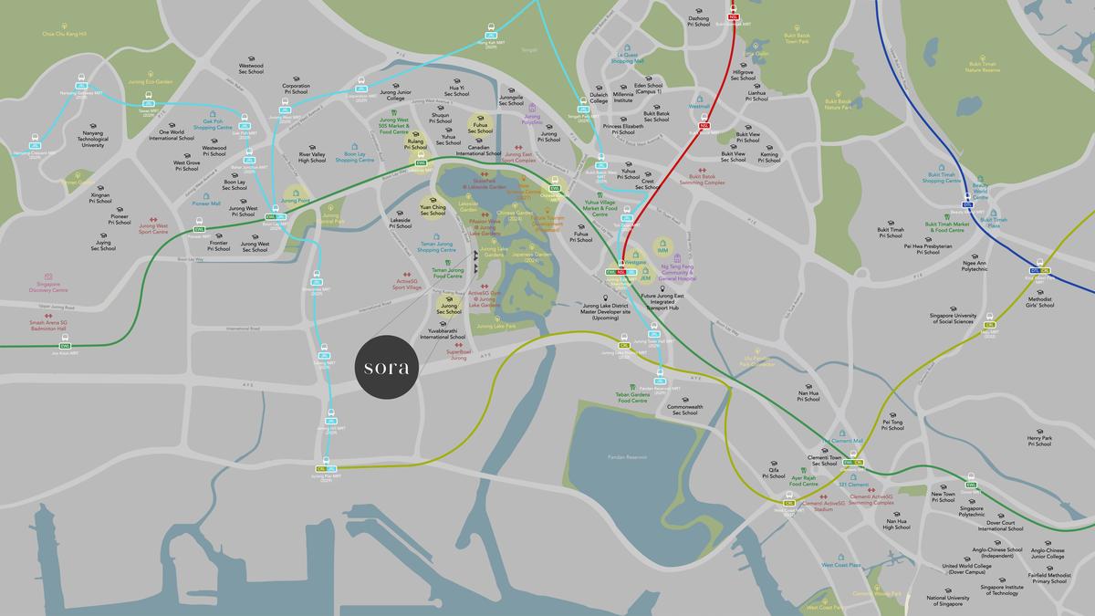 SORA is strategically located in District 22, within the rapidly developing Jurong Lake District, planned as Singapore’s second Central Business District. The development enjoys excellent connectivity with the Chinese Garden and Lakeside MRT stations, just a 10-minute walk away. In addition, the Jurong East MRT interchange is a 30-minute walk or a quick bus ride, connecting residents to the North-South and East-West lines, as well as the upcoming Jurong Region Line.