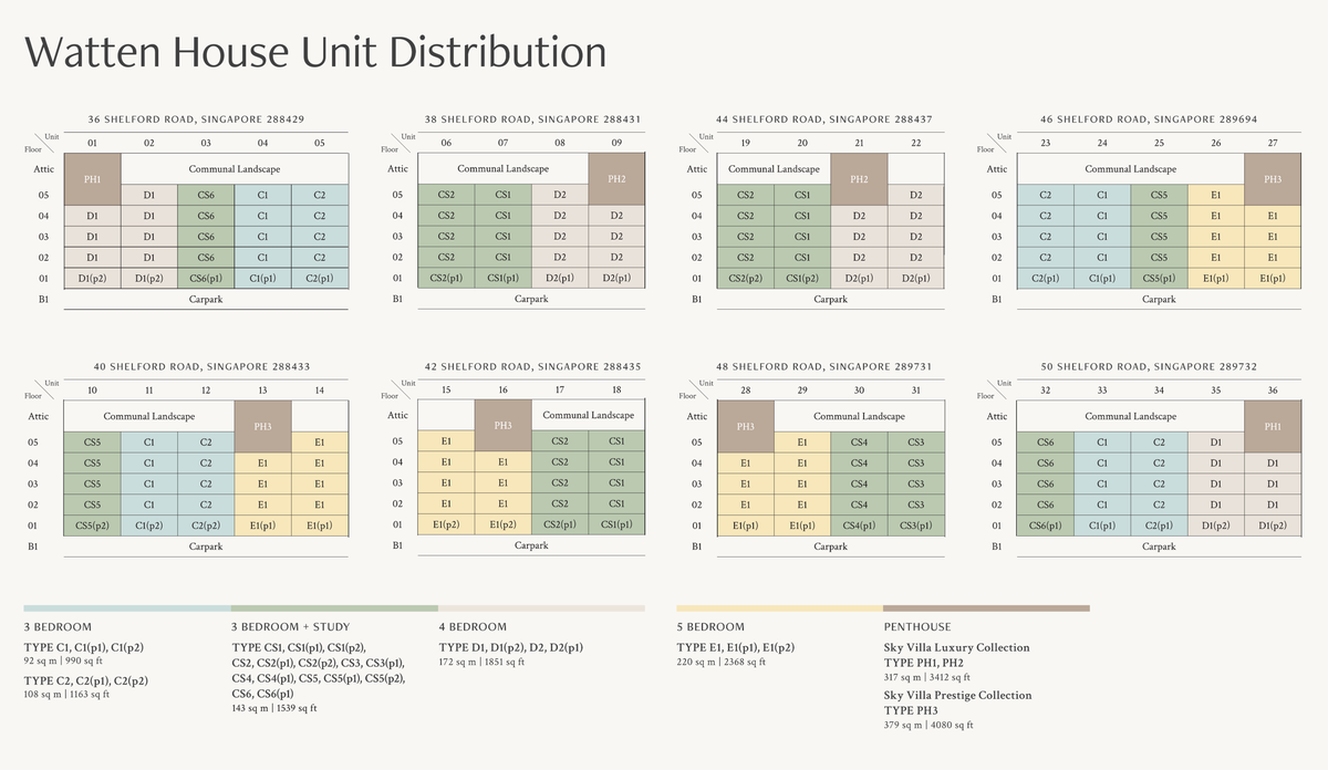 Watten House is a highly anticipated, newly launched residential development located at 36 to 50 Shelford Road in the prestigious District 11, Bukit Timah. Due to TOP by 30 June 2027, this freehold development will comprise eight five-storey blocks with an estimated 180 units. This low-density, exclusive project will provide residents with a tranquil, resort-style living environment with meticulously designed luxury homes in one of Singapore’s most coveted neighbourhoods.